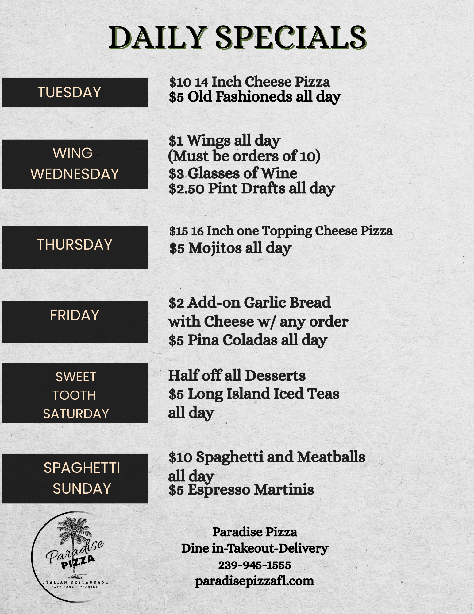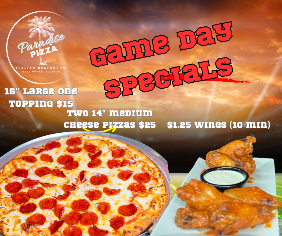 Serving Cape Coral for over 23 years, Paradise Pizza in Cape Coral, Florida serves the highest quality Italian Specialties around! Our dine-in customers will enjoy a a neighborhood family environment with spacious seating both inside and outside on our patio.